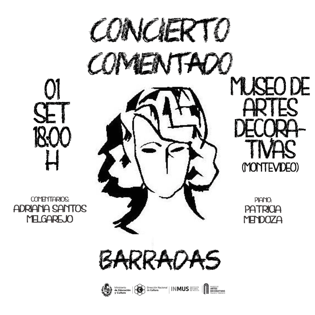 Actividad realizada en Barcelona con el apoyo de Ibermúsicas, el Dpto. de Internacionalización de la Cultura del MEC de Uruguay, el auspicio de la Embajada de Uruguay en Argentina y la Universidad de las Artes de Argentina. Patricia Mendoza, piano. Adriana Santos Melgarejo, comentarios. La Dra. Romina Dezilio de la Universidad de las Artes, actuó como moderadora del concierto comentado y de las preguntas del público. El evento contó con el apoyo del Instituto de Musicología Carlos Vega perteneciente al Ministerio de Cultura de Argentina y de la Universidad de las Artes de Argentina en Buenos Aires.